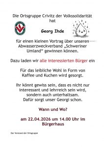 Die Ortsgruppe Crivitz der Volkssolidarität lädt alle Interessierten am 22.04.2026 um 14:00 Uhr in das Crivitzer Bürgerhaus zum Vortrag von Georg Ihde über den Abwasserzweckverband „Schweriner Umland“ ein. mehr…
