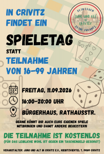 Der Verein Jung & Alt in Crivitz e. V. lädt am 11.09.2026 zum Spieletag ins Bürgerhaus Crivitz ein.
